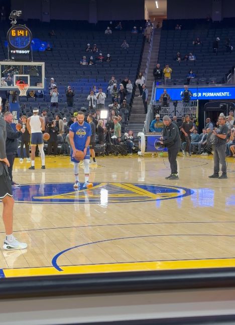 赛前热身环节,库里在logo位置练习三分投射,抬手就有。